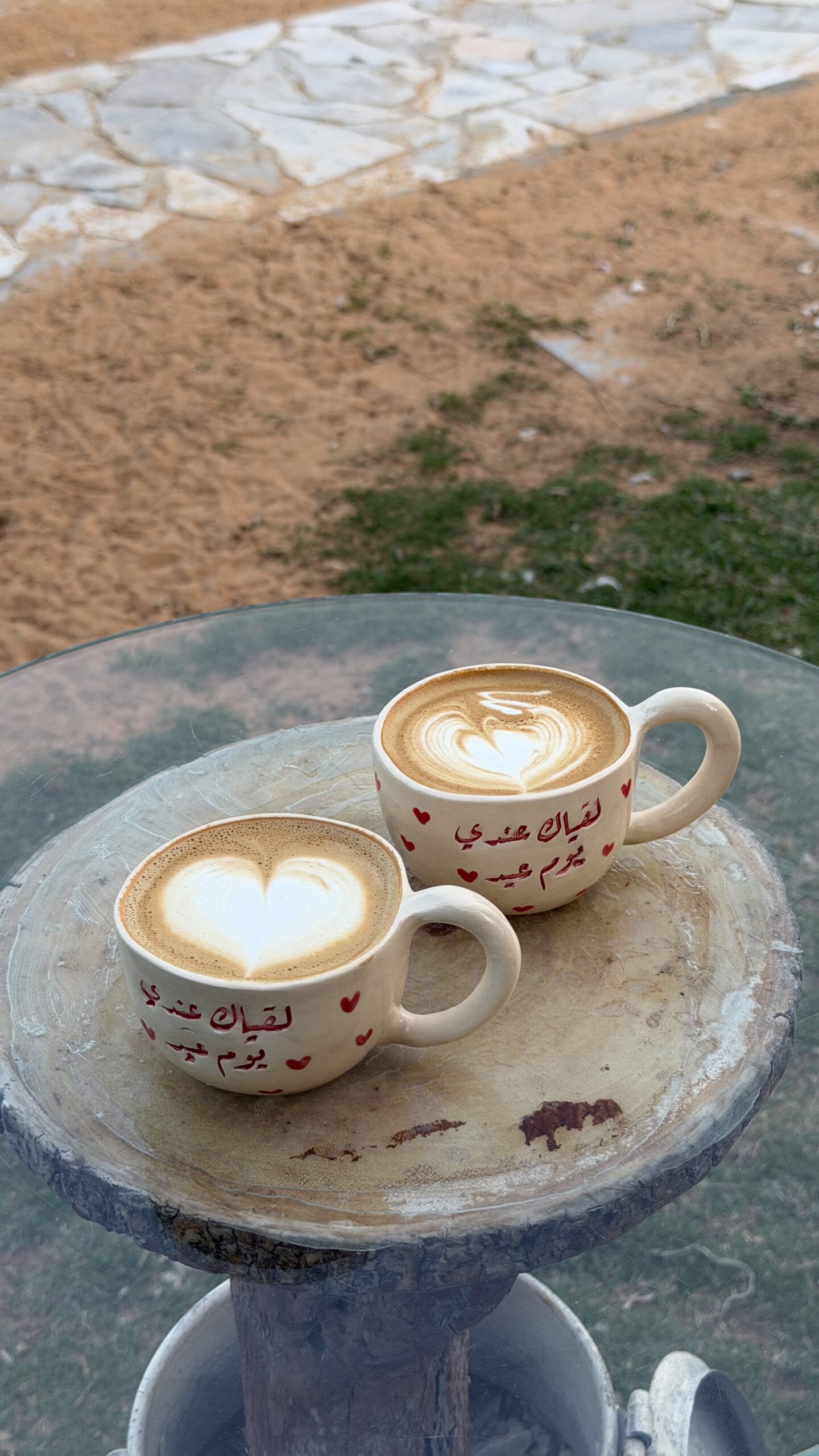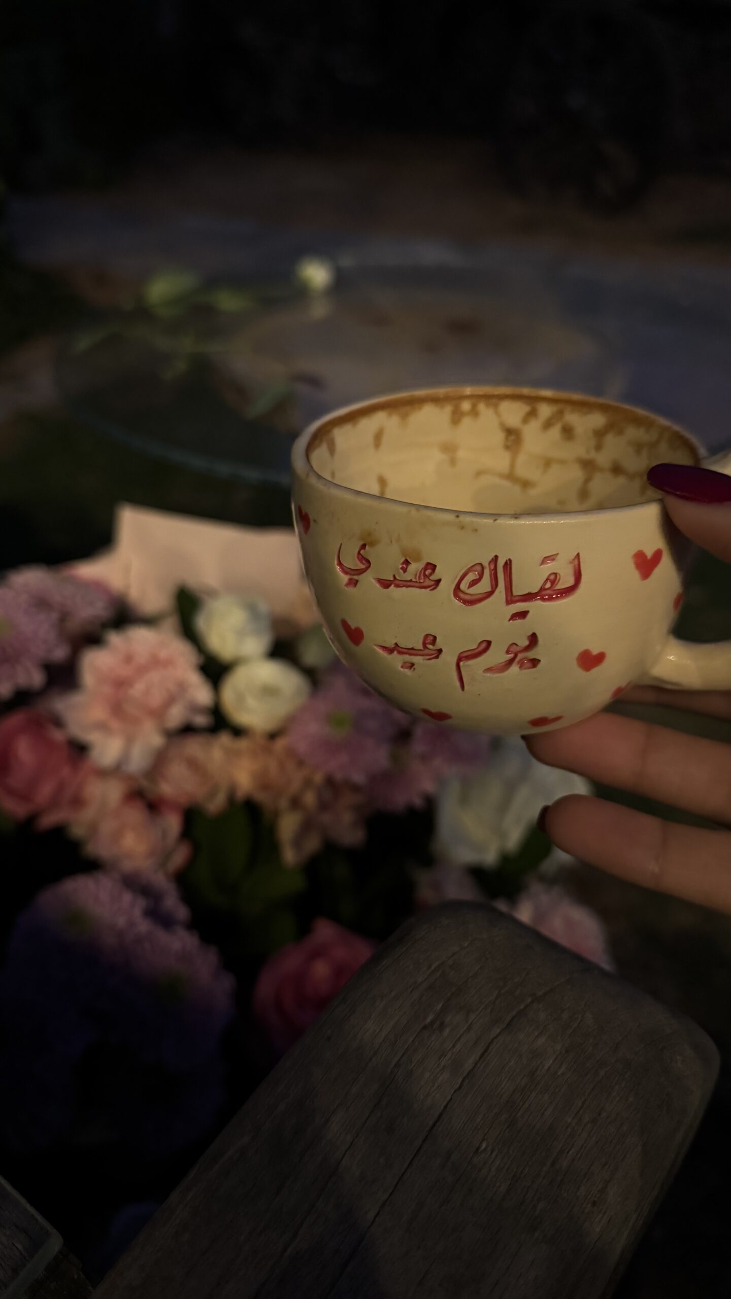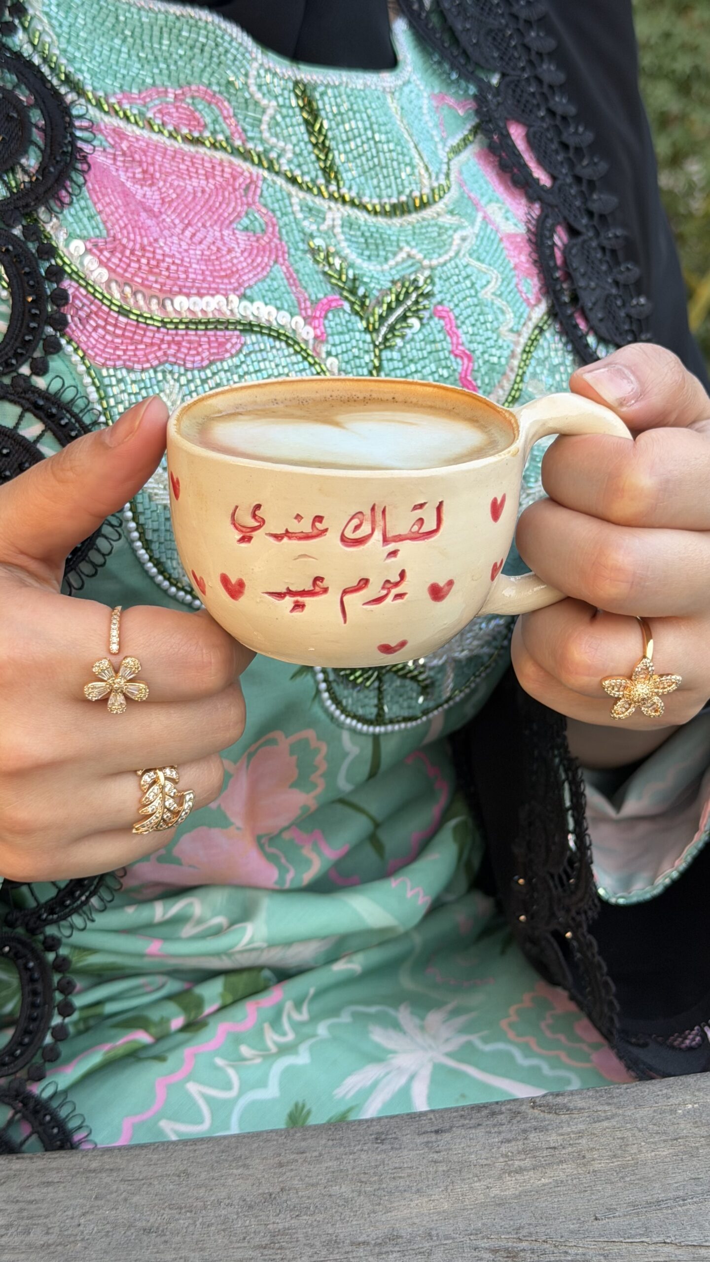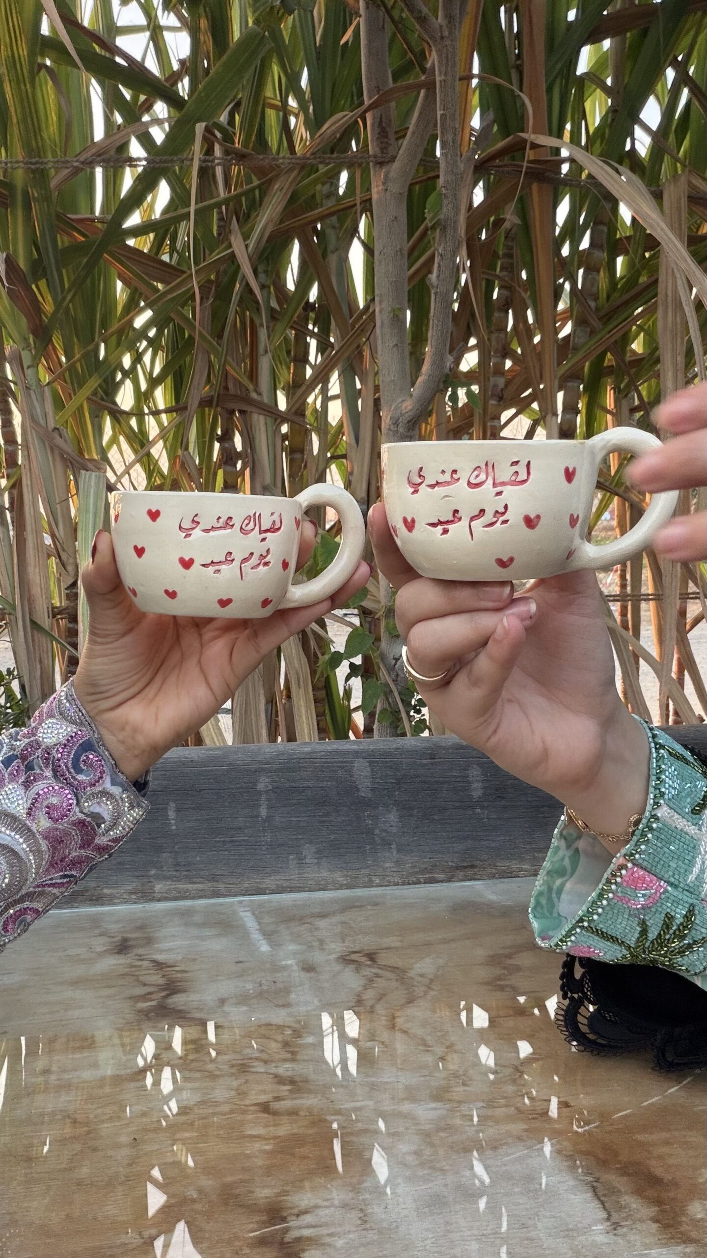 Unique Handmade Ceramic mug with unique design written لقياك عندي يوم عيد